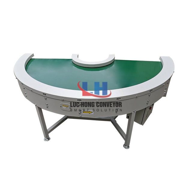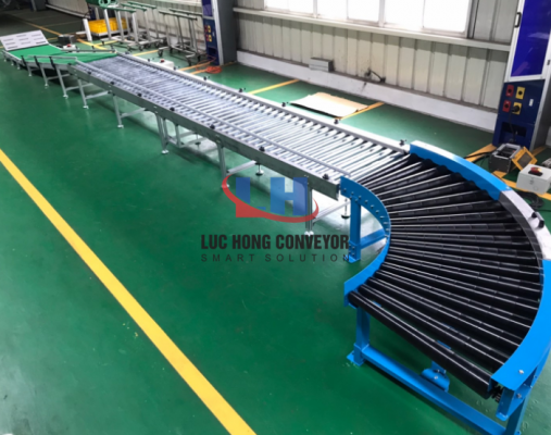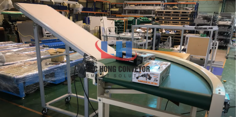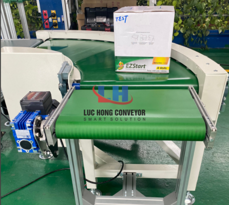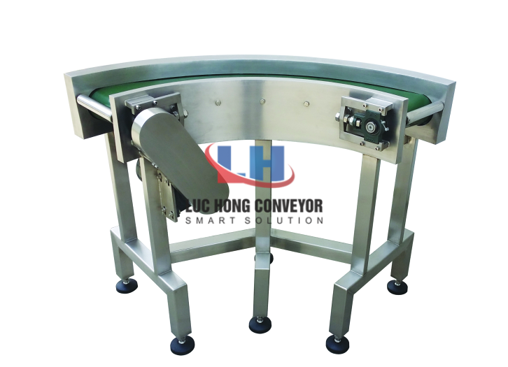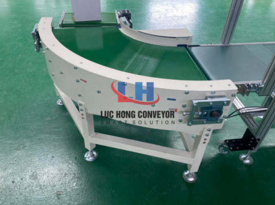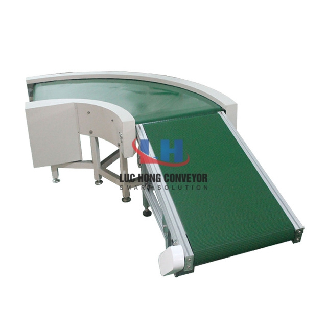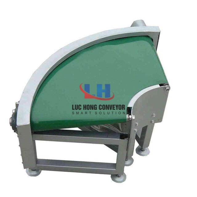Băng tải cong có tác dụng chuyển được hướng vận chuyển các sản phẩm theo góc cong. Có thể là góc cong từ 45 độ, 90 độ, 120 độ, 180 độ theo nhu cầu cần thiết của đơn vị doanh nghiệp sản xuất. Dòng băng tải này được cấu tạo với bề mặt tiếp xúc khá bằng phẳng và rộng thích hợp sử dụng để vận chuyển các sản phẩm có kích thước lớn mà quy trình hoạt động vẫn ở mức ổn định. Loại băng tải này được ứng dụng phổ biến trong nhiều ngành sản xuất công nghiệp như điện tử, thực phẩm, dược phẩm, linh kiện…