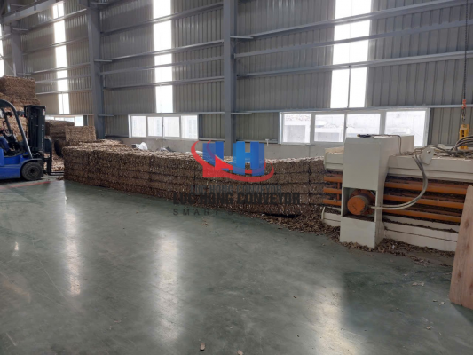 + Máy ép Lực Hồng sẽ tiến hành ép các giấy vụn được đổ xuống từ silo thành những kiện giấy vuông vức